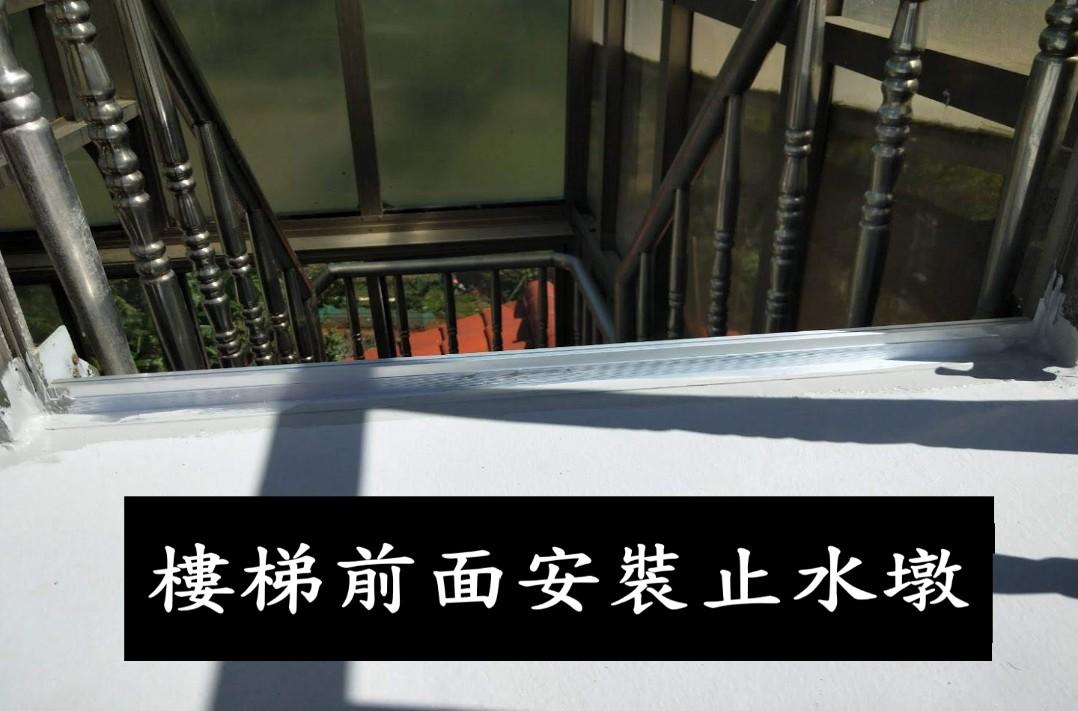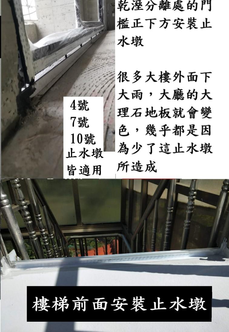 防水層容易從內90度角處裂開,得意止水墩的內90度角,就算防水層從內90度角處裂開,碰到的也不會是止水墩與地面的接縫處,而是一整成型的鋁合金擋著,以上都是其他替代品,容易遇到的問題。