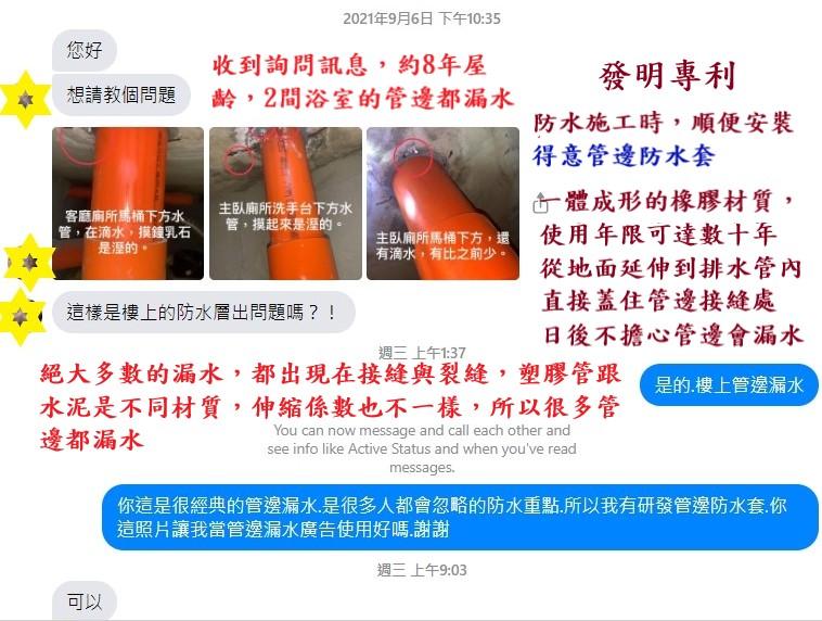 只要總價不到台幣500元的3個管邊防水套,即可確保地面管邊數十年不漏水,還有什麼能比發明專利的[得意管邊防水套]更簡單、更耐用呢?!