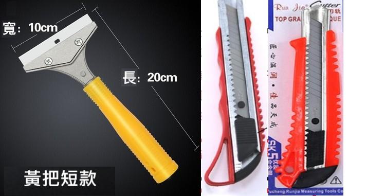 清潔用刮刀 黃把手長度約20公分 紅把手長度約37公分 可以使用一般美工刀的刀片 民宅防水修繕施工中,有時會將防水材料滴在地板或是玻璃上面,所以讓大家方便選購使用
